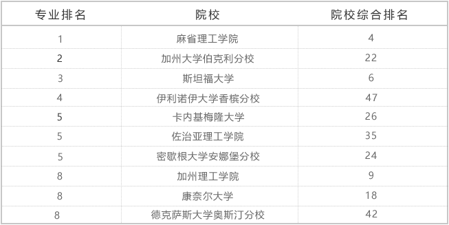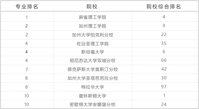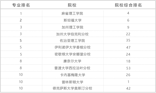 電子工程專業(yè)的分支和研究方向眾多,因此申請人數(shù)以及申請人的背景也是豐富多樣的,也決定了這個申請方向競爭的激烈程度。電氣工程是美國大學研究生的熱門專業(yè),基本上US-News綜合排名前200的學校都會開設該專業(yè),世界級麻省理工、加州理工等均設有該專業(yè)。由于良好的就業(yè)前景,電氣工程一直占據(jù)理工科申請人數(shù)的頭把交椅。專業(yè)排名